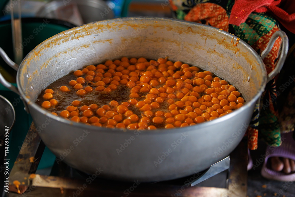 Making original golden Thai dessert process traditional culture production ingredient golden egg yolk in water boiled sweet sugar syrup, Golden drops,Thong Yod.