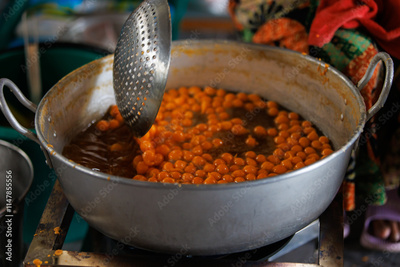 Making original golden Thai dessert process traditional culture production ingredient golden egg yolk in water boiled sweet sugar syrup, Golden drops,Thong Yod.