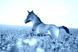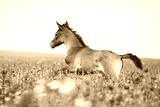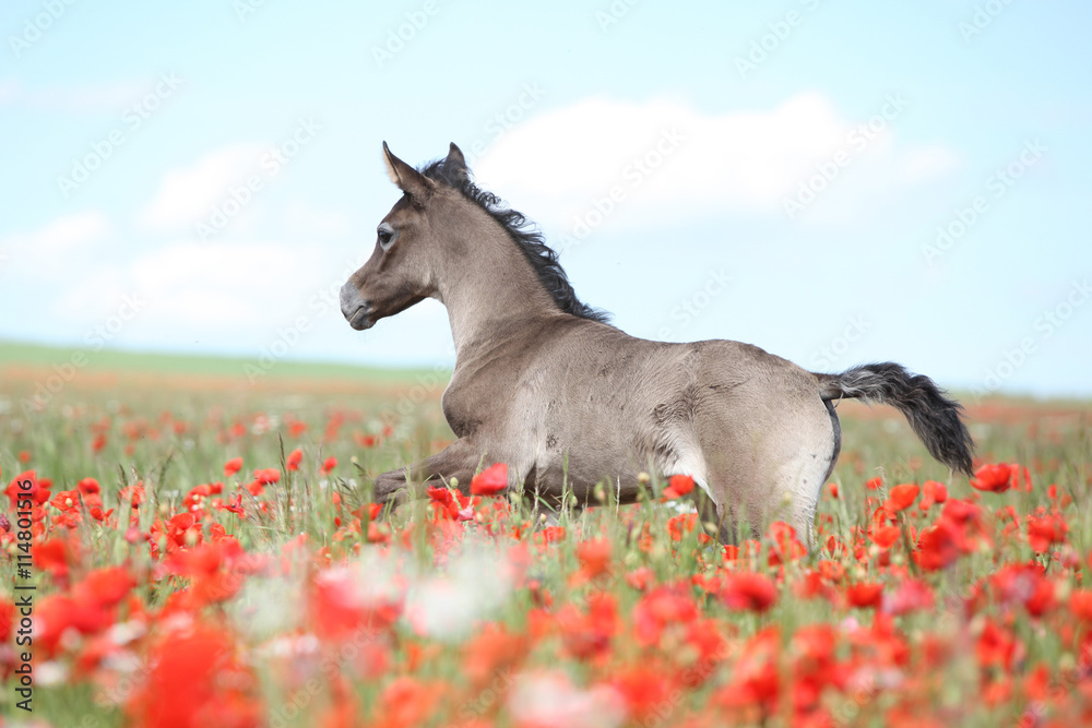 Amazing arabian foal running in red poppy field