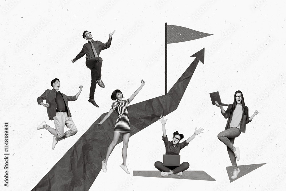 Creative photo 3d collage artwork poster postcard picture of many happy people celebrating success isolated on painting background
