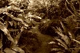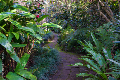 Bended path in tropical garden surrounded with exotic plants and camellia flowers. Camellia gardens, Sutherland Shire, Australia