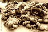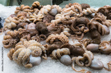 Raw fresh octopus on ice. Seafood restaurant, cafe display, showcase. Selective focus
