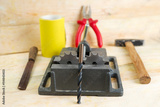 The vise to clamp on a wooden desktop environment tools