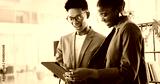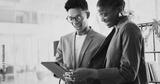 Collaboration, research and tablet with business people in office for sustainability manager, eco consultant and planning. Environment policy, climate change solution and teamwork with employees