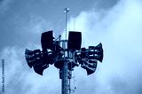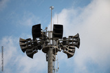 Detail of the upper part of a speaker and communications tower where large events are held, the tower has speaker antennas, horns, security cameras and other telecommunication devices