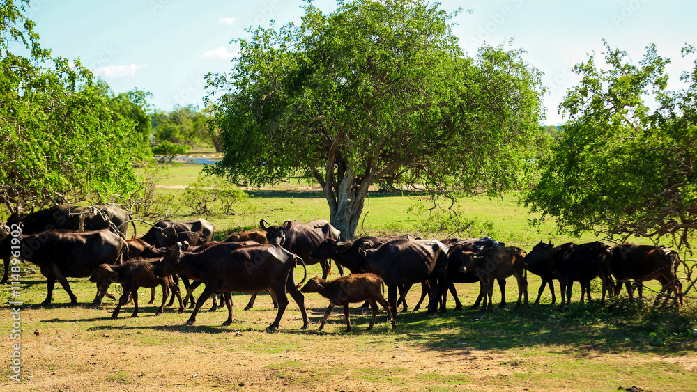Herd of buffaloes in a national park in Sri Lanka. Safari Sri Lanka
