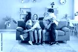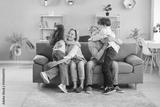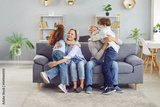 Grandparents and children having fun at weekend. Grandma and grandpa are happy to see kids. Grandmother and grandfather sitting on grey sofa and hugging grandchildren. People, family, love concepts