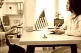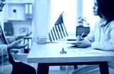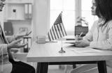 Young man sitting in office of US public services or embassy having consular visa interview with woman official on her workplace with American flag at the desk holding immigration application.