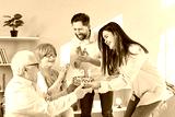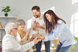 Smiling happy adult children congratulating their senior father giving him cake at home. Happy family celebrating birthday with sitting on sofa in living room. Family holiday celebration concept.