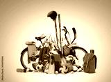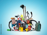 Sports equipment has fallen down in a heap