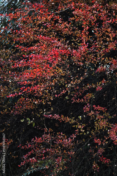 Barberry bush with autumnal foliage. Berberis vulgaris or Berberis thunbergi in the garden