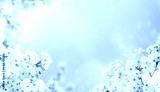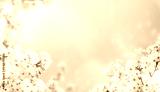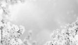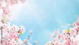Branches of blossoming cherry macro with soft focus on gentle light blue sky background in sunlight with copy space. Beautiful floral image of spring nature.
