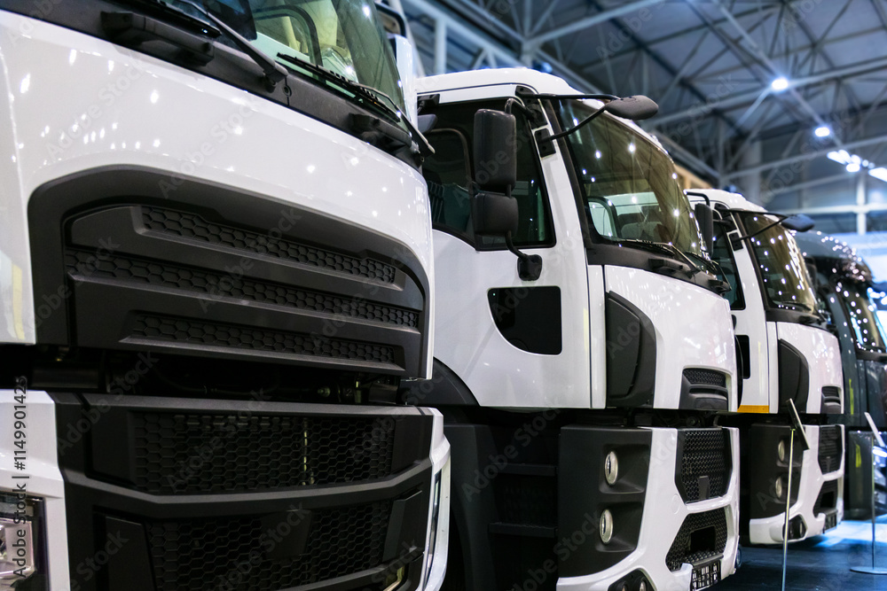 A row of new, white trucks parked indoors