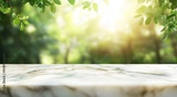 Marble table in sunny green forest.