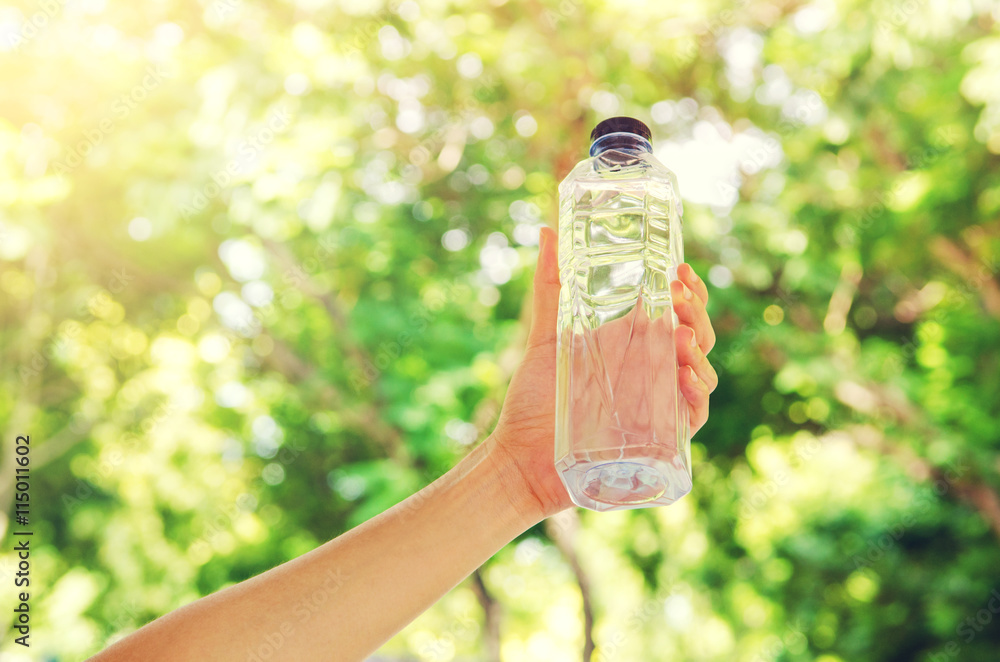 Close up female hand holding water at summer green park outdoor and bokeh nature background, healthy concept.