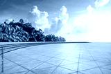 Empty square floor and green forest with sky cloud natural landscape in summer. Outdoor square background.