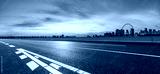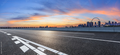 Asphalt highway road and city skyline with modern buildings scenery at dusk in Shenzhen, China. Outdoor road background.