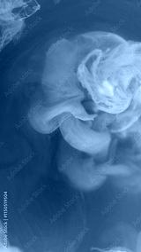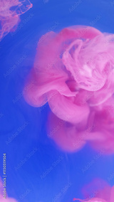 Acrylic paint. Pigment underwater. Defocused bright pink blue splash ink mist cloud moving on abstract blue art background.