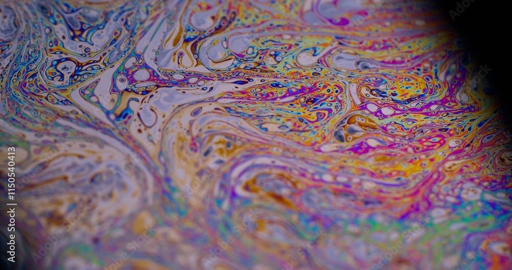 Abstract liquid. Bubble decoration. Defocused multicolor purple green oil paint curve acrylic slick on dark black blurred light art background.