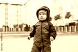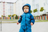 A little boy in overalls runs on the street. A child in a raincoat walks in the yard. Children's overalls are mudproof