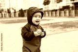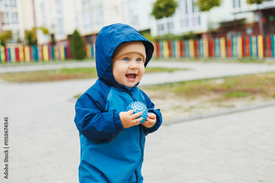 A little boy in overalls runs on the street. A child in a raincoat walks in the yard. Children's overalls are mudproof