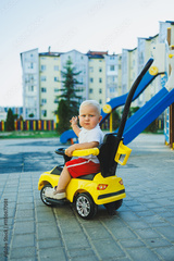 A little boy rides a tolocar. Tolokar for babies. Children's car for skating.
