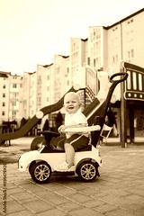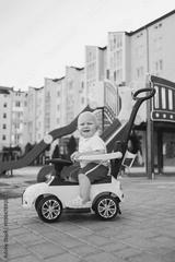 A little boy rides a tolocar. Tolokar for babies. Children's car for skating.