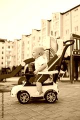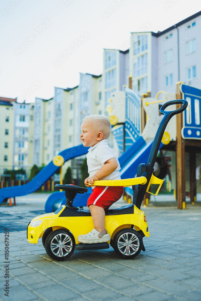 A little boy rides a tolocar. Tolokar for babies. Children's car for skating.