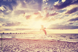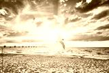 Vintage toned sunset over sea with flying bird in front.