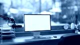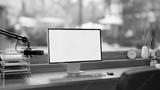 A minimalist podcast studio featuring a microphone, a computer with a white screen mockup, and decor