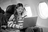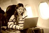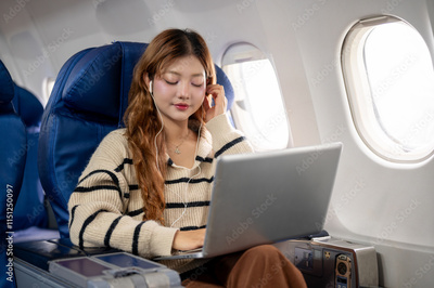 An attractive Asian woman wearing earphones and working on her laptop during the flight.