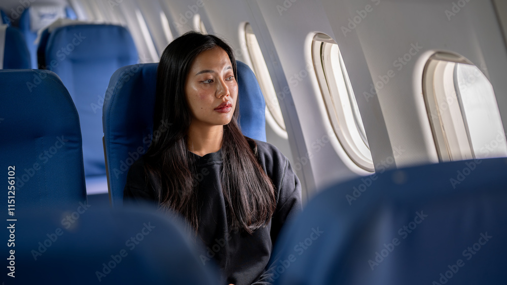 Thoughtful, lonely Asian woman travels alone on holiday, sitting on the flight with a sad expression