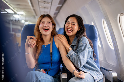 Two joyful Asian female friends, excited for their vacation, sit on a plane with happy expressions.