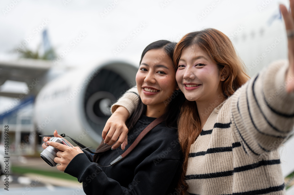 Two female friends, excited for their trip together, are enjoying taking a selfie at the airport.