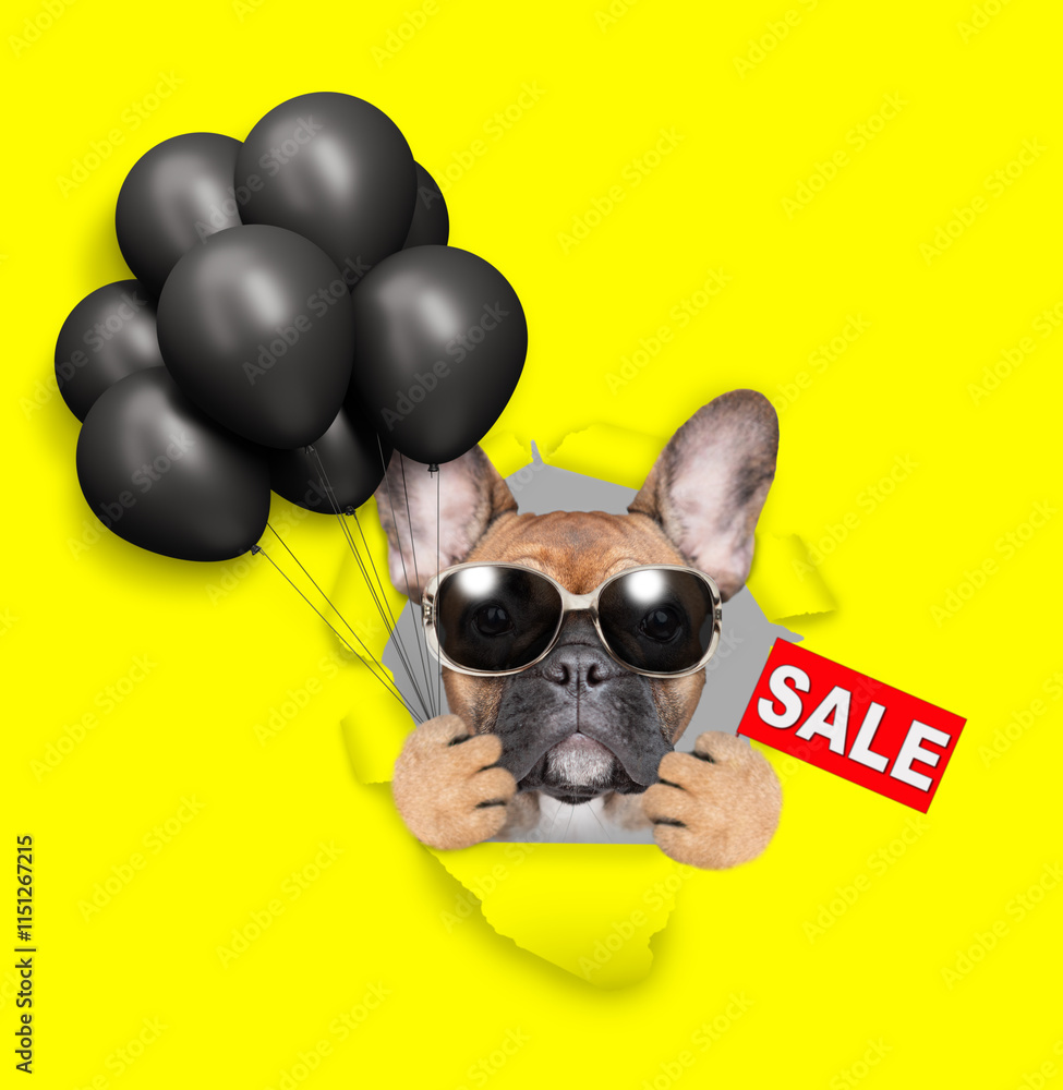 Funny French Bulldog puppy wearing sunglasses looks through the hole in yellow paper, holding black balloons and showing signboard with labeled "sale".