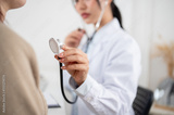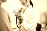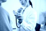 A doctor using a stethoscope to listen to a patient's lung and heartbeat sounds.