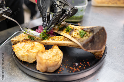 A close-up of a chef’s hands in black gloves preparing a gourmet dish featuring roasted bone marrow topped with herb garnish, served with toasted bread on a black plate.