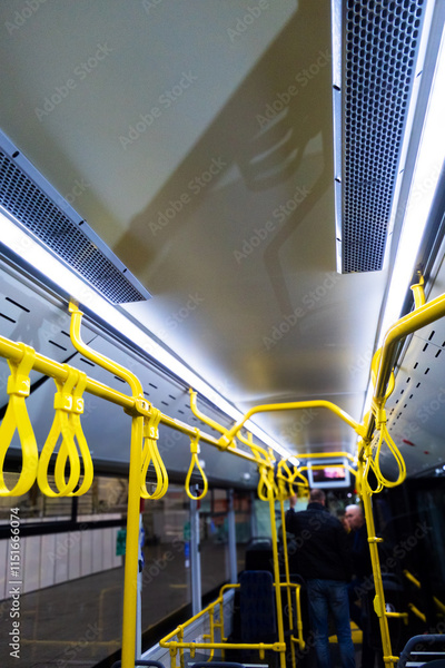 The interior of a modern public transport vehicle, featuring bright yellow handrails and handles for standing passengers.