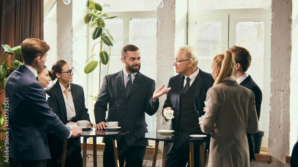 Group of young colleagues in formal wear talking with senior businessman in friendly conversation during coffee break. Exchange of ideas and team building. Concept of business, office, teamwork