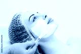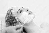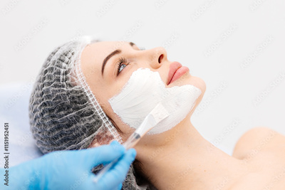 Close-up of a young woman during a facial skincare treatment in a professional beauty salon. A cosmetologist applies a clay mask. Concept of cosmetology, skincare, and skin rejuvenation.