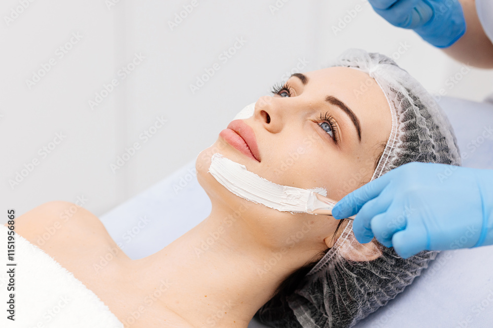 A cosmetologist applies a clay mask to a young, beautiful woman’s face with a cosmetic brush. Concept of cosmetology, youth, and effective skincare.