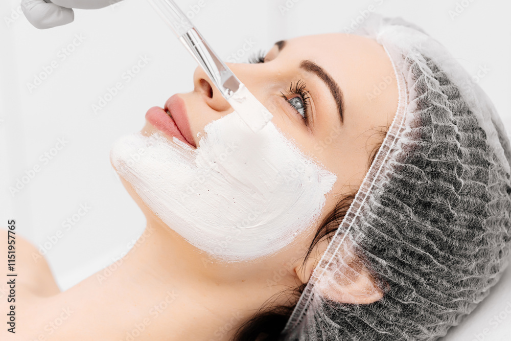 Close-up of a young woman during a facial skincare treatment in a professional beauty salon. A cosmetologist applies a clay mask. Concept of cosmetology, skincare, and skin rejuvenation.