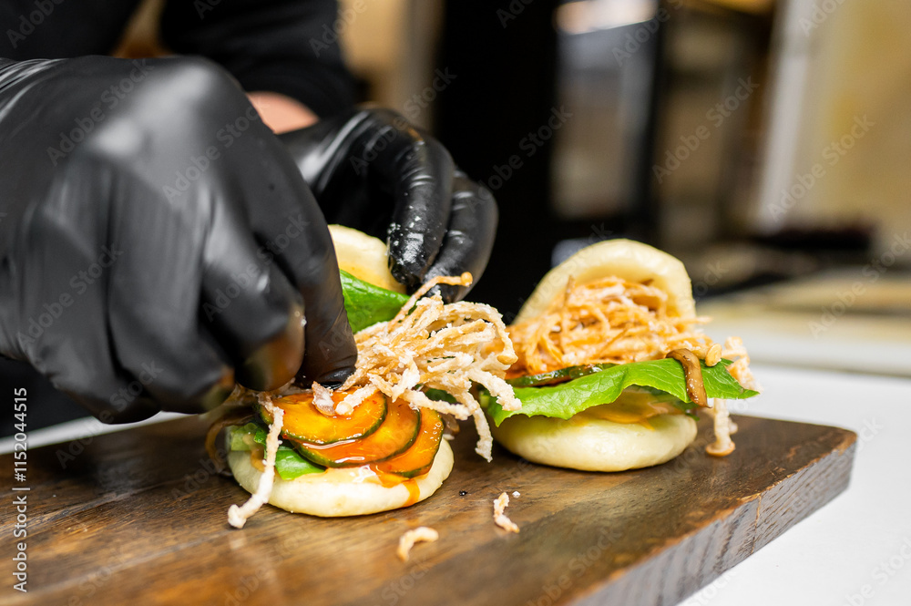 Close-up of a chef's hands assembling gourmet bao buns with crispy toppings, fresh vegetables, and flavorful sauces, showcasing vibrant colors and textures on a wooden serving board.