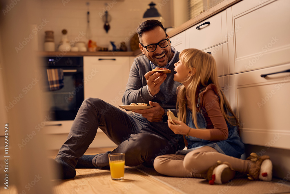 Happy father and daughter having fun while eating sandwiches in kitchen.