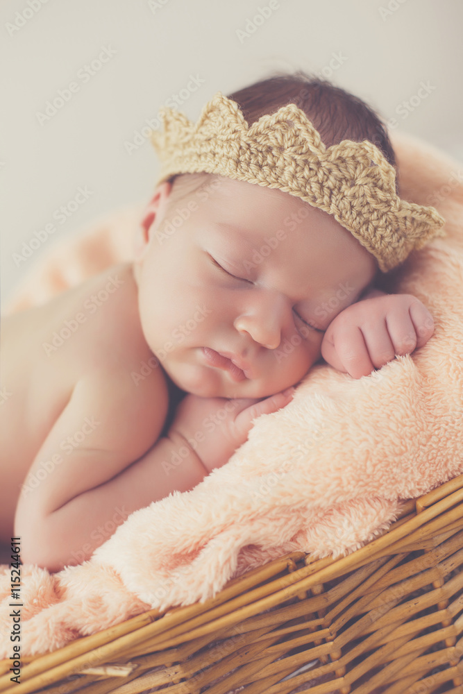 Adorable little guy,in a beige knitted crown,tucked under his legs and put the handle under his head,sound asleep on the soft beige blanket in a large wicker basket high,sweet sleeping newborn baby