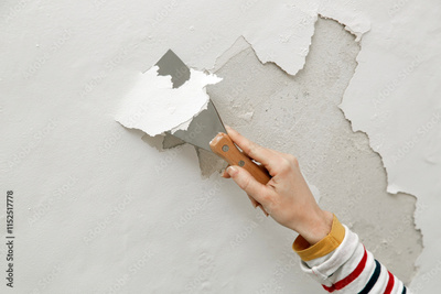 Saltpeter or mold on the wall problem. Woman is using a scraper to scrape and remove all loose paint and plaster that is in poor condition, until a firm surface is achieved.