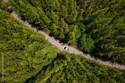 Aerial view of dark green forest road and white electric car Natural landscape and elevated roads Adventure travel and transportation and environmental protection concept