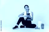 A happy, healthy Asian woman in sportswear sits on a white studio background and uses her smartphone