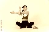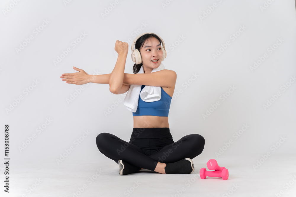 A sporty Asian woman in sportswear enjoying listening to music while stretching her arms.