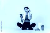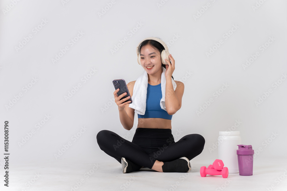 Happy Asian woman sitting on a white studio background, using her smartphone and listening to music